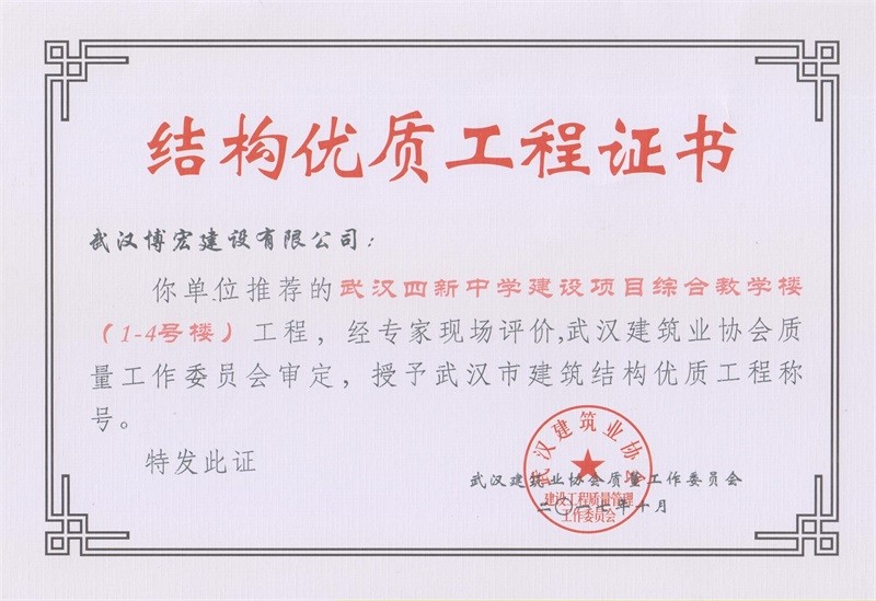 結(jié)構(gòu)優(yōu)質(zhì)工程證書(shū)(武漢四新中學(xué)教學(xué)樓)