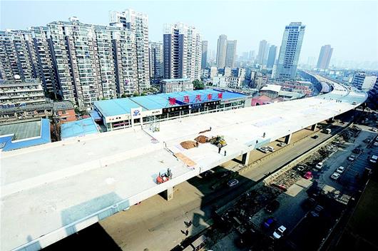 昨日,記者來(lái)到雄楚大街改造工程指揮部發(fā)現(xiàn),這里異常繁忙,工人們都在忙著搭腳手架、趕進(jìn)度。記者看到,雄楚大街高架梅家山立交至武漢理工大學(xué)段橋面已全線(xiàn)貫通,整條高架已成形。對(duì)接二環(huán)線(xiàn)珞獅南路高架的接線(xiàn),正在緊張施工中。施工方介紹,昨日貫通的一段將于今年五一通車(chē)。據(jù)了解,二環(huán)線(xiàn)漢陽(yáng)方面,只剩下龍陽(yáng)大道墨水湖北路至知音橋段仍在施工中,其他路段均已通車(chē)。