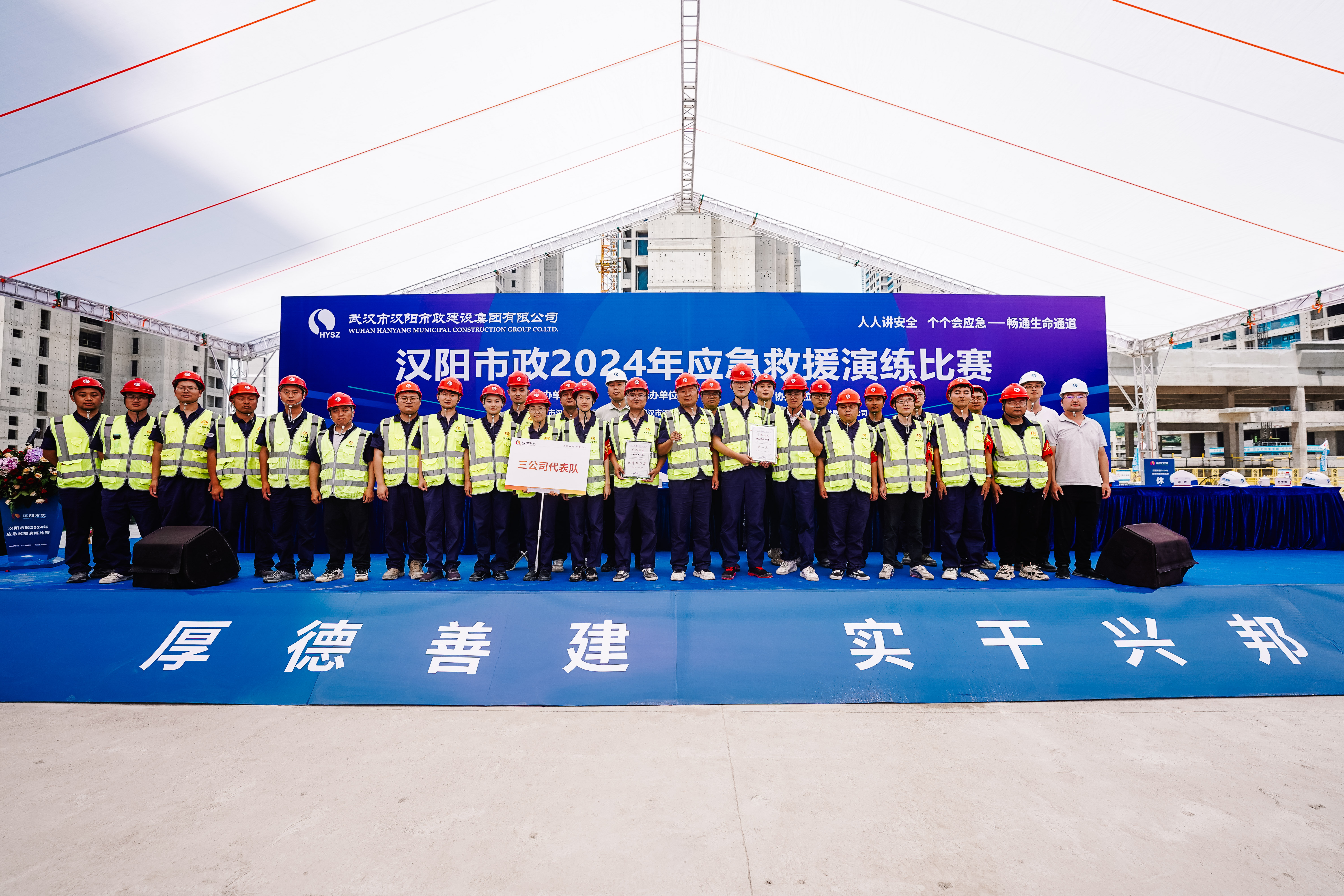 6月7日上午,漢陽市政2024年“安全生產(chǎn)月”啟動儀式暨應(yīng)急救援演練比賽在米糧村還建房 B 地塊舉行,博宏建設(shè)在應(yīng)急救援演練比賽中勇奪第一名。